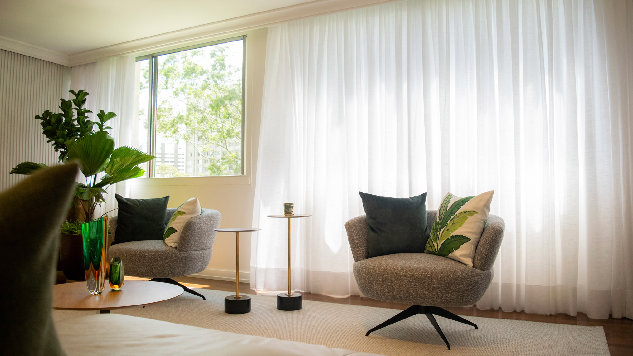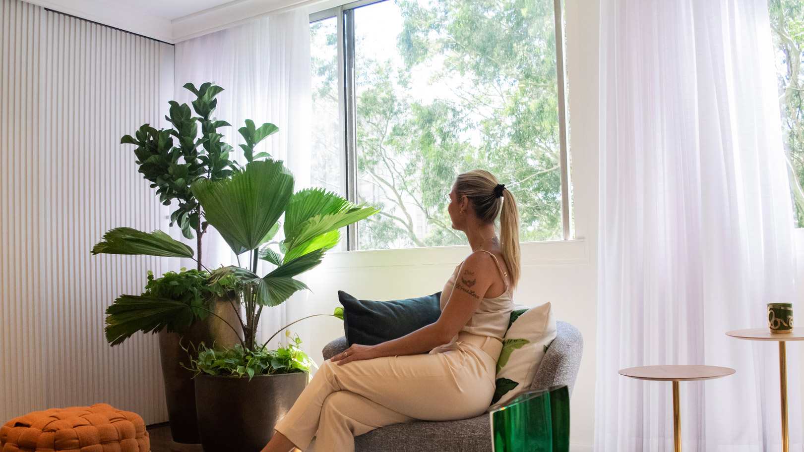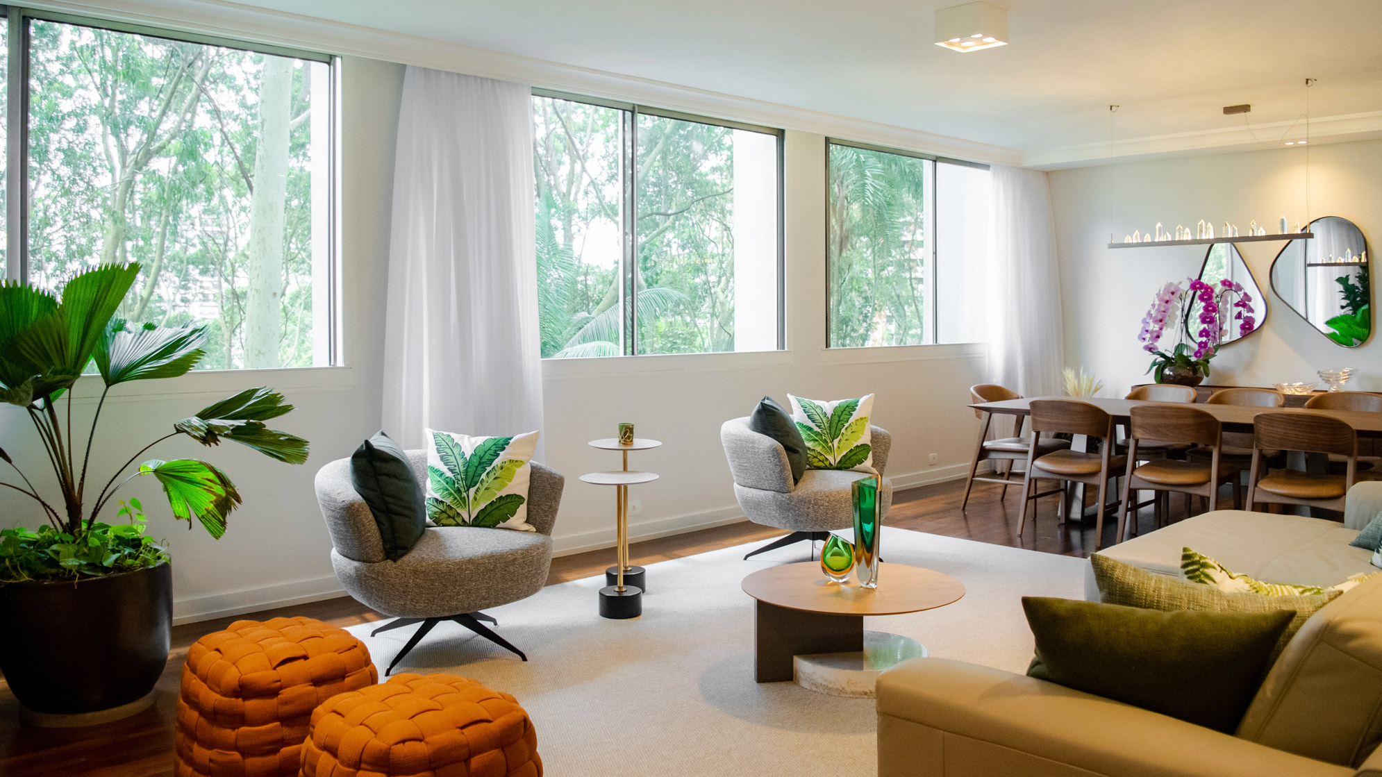 Cortinas leves, paleta orgânica e integração de ambientes criam um cenário calmo e acolhedor. Cada escolha transmite frescor e harmonia, transformando o apartamento em um espaço de bem-estar contínuo.